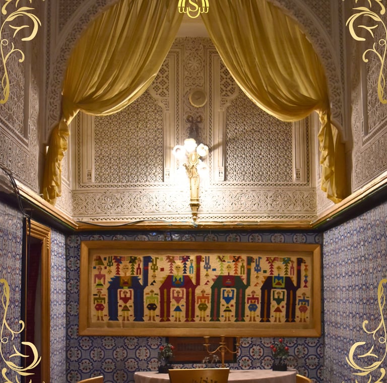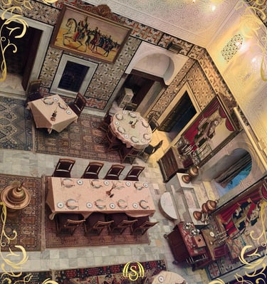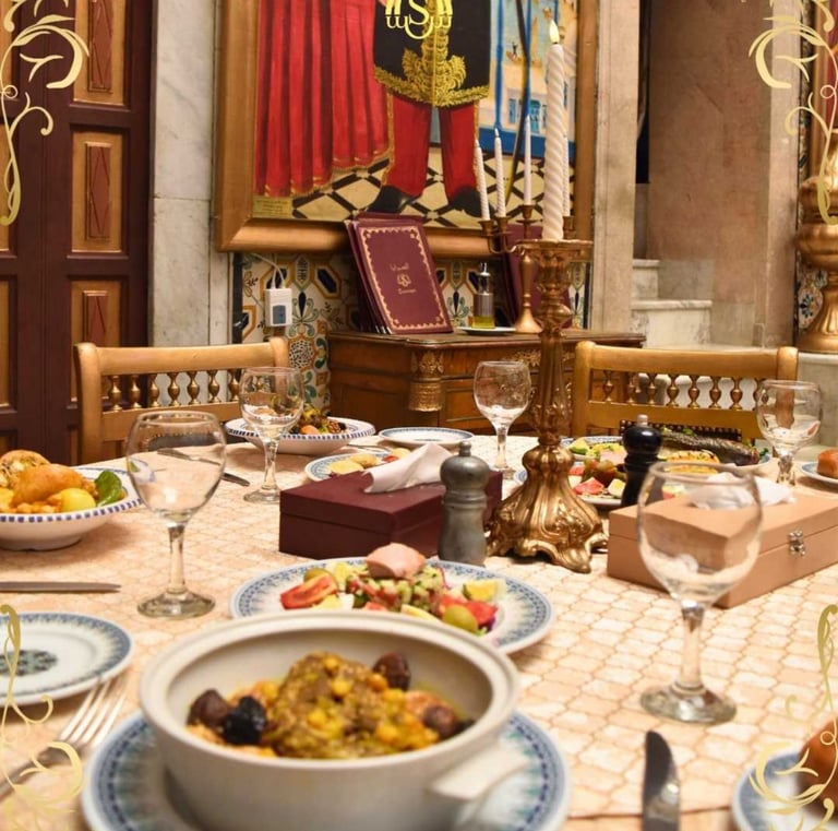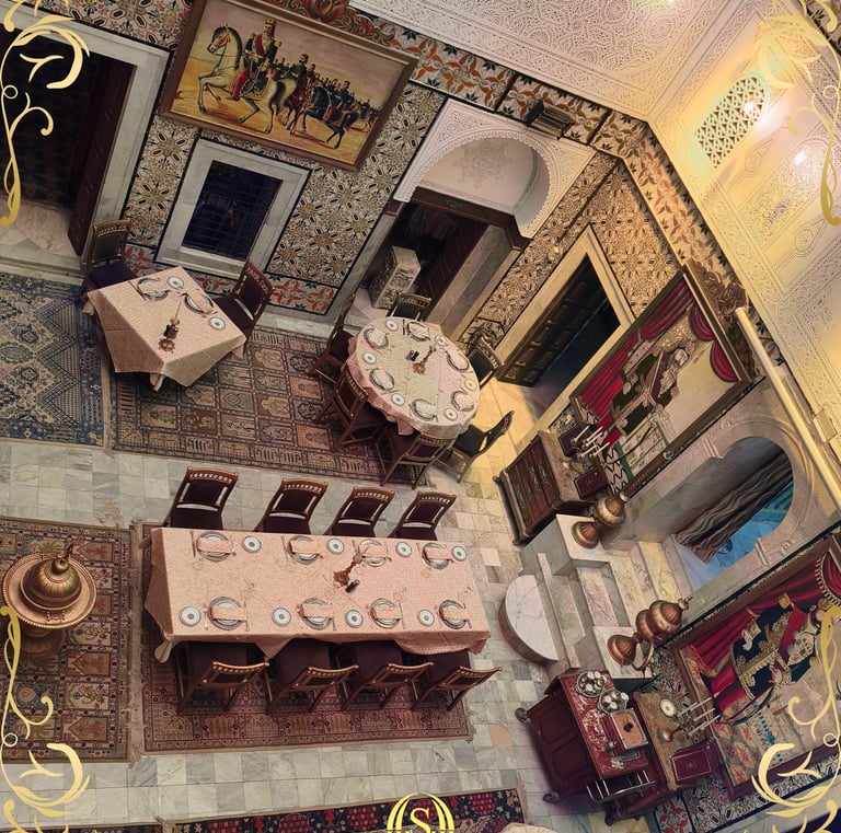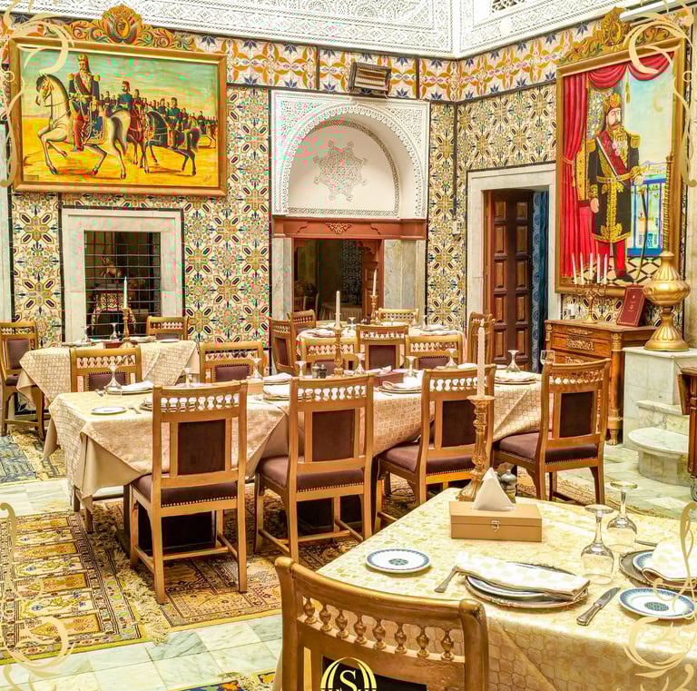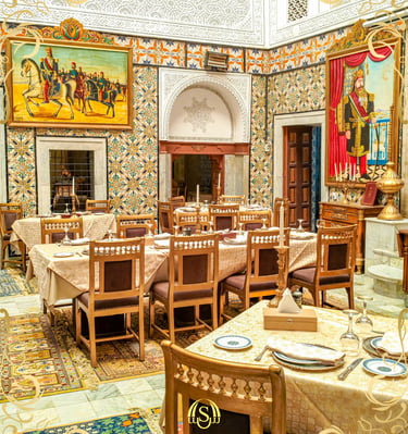 Essaraya, un restaurant gastronomique, offre une galerie d'art unique, mettant en valeur l'art tunisien et l'artisanat, dans un cadre historique et raffiné à Tunis.